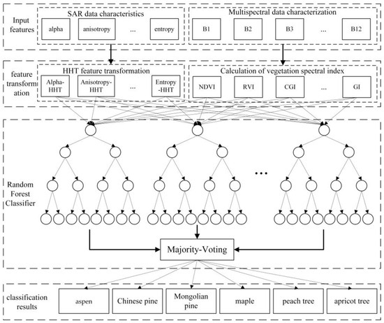 Considering the complexity and nonlinearity of forest species classification based on multi-source remote sensing data, it is difficult for existing generalized machine learning models to achieve the accurate classification of forest species in a natural state. Therefore, we proposed a multi-source remote sensing forest species classification method based on the above vegetation spectral features and the Hilbert–Huang transform of PolSAR signals. The model consists of two parts, as shown in Figure 2: (1) the feature transformation module—used to transform PolSAR features and multispectral remote sensing reflectance to obtain new features that can more accurately represent tree information, such as the vegetation-based spectral variables, etc.—and (2) the stochastic forest classifier module. Because the number of data samples is limited by the amount of measured forestry survey data in our study, the stochastic forest classifier, with its excellent classification effect under small-sample conditions, was chosen. Additionally, the random forest classifier, which has an excellent classification effect under small-sample conditions, was chosen as the base model, and hyperparameter optimization was based on the particle swarm algorithm [45].