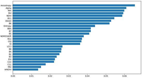 In the regional forest species classification study, we accurately classified the forest species in the study area based on multi-source remote sensing forest species classification methods [61,62]. The model input variables were divided into two parts, namely, multi-source remote sensing data and measured forest survey data. Among them, the multi-source remote sensing data included the Normalized Vegetation Index (NDVI), the Normalized Humidity Index (NHI), the Optimized Soil Conditioning Vegetation Index (OSAVI), the Chlorophyll Index (CGI), the Greenness Index (GI), the Moisture Stress Index (MSI), the Red Edge Normalized Vegetation Index (reNDVI), the Enhanced Vegetation Index (EVI), and the Ratio Vegetation Index (RVI), along with the Chlorophyll Content Index (LCCI), the Normalized Difference Red Edge Index (NDRESWIR), and 11 other spectral vegetation features, in addition to the reflectance of multispectral data and second-order eigenvalues of five polarization observation variables, such as the main diagonal elements of the C2 matrix (C11 and C22) [63], and the H-alpha decomposition parameter (alpha, anisotropy, and entropy) modal function (IMF) [64]. Before random forest species classification, we first performed feature selection based on random forest importance ranking, as shown in Figure 3. In Figure 3, reNDVI and MSI were significantly less important than other features in forest species classification, so we removed these two features. We input the tree species information obtained from the 550 measured forest survey sites described in Section 2.2 and the 26 multi-source remote sensing features mentioned above into the tree species classification module at a ratio of 0.7:0.3, before optimizing the random forest model for parameter tuning based on the particle swarm algorithm. Among them, the tree species information is the type of tree species in the measured sample sites, and the multi-source remote sensing information includes the B1–B12 bands, the vegetation-based spectral variables shown in Table 1, and the five PolSAR features mentioned above. Then, we selected the optimal random forest model parameters for making inferences regarding the tree species in the study area. Regarding the model parameters, n_estimators are 100, max_features is all features. Table 2 represents the classification accuracy of multi-source remote sensing forest species classification methods, with overall classification accuracy and the Kappa coefficient as the evaluation criteria. As shown in Table 2, the overall classification accuracy of the model is 0.951, and the Kappa coefficient is 0.94. This shows the effectiveness of multi-source remote sensing forest species classification methods in the task of classifying forest species in the region.