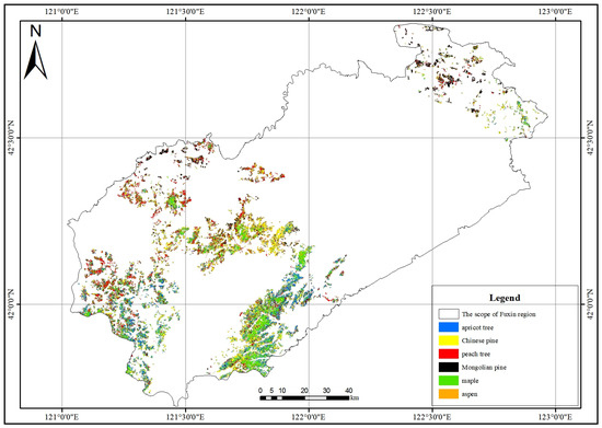 In our tree species classification study, based on the optimal input feature combinations and training hyperparameters obtained in Section 4.1, as shown in Figure 4, the white-colored part of the Fuxin area is the non-forested area, consisting of towns, waters, and farmland. The non-forested area was not involved in our forest species classification based on expert visual interpretation. In addition, in order to highlight the differences between different tree species, we display the six dominant tree species in different colors in the forest species distribution map of the study area, shown in Figure 3, including aspen, Chinese pine, maple, Mongolian pine, peach tree, and apricot trees.