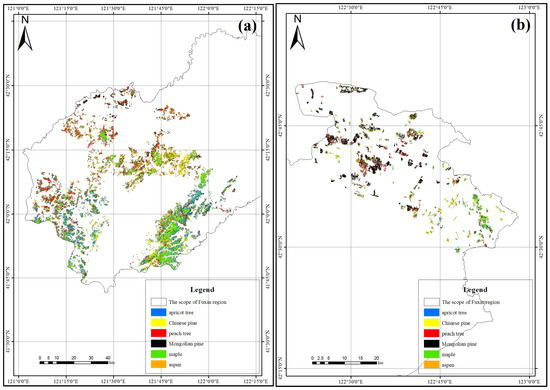 Map of localized forest species distribution in the study area. (a) Map of forest species distribution in the southwestern part of the study area. (b) Map of forest species distribution in the northeastern part of the study area.