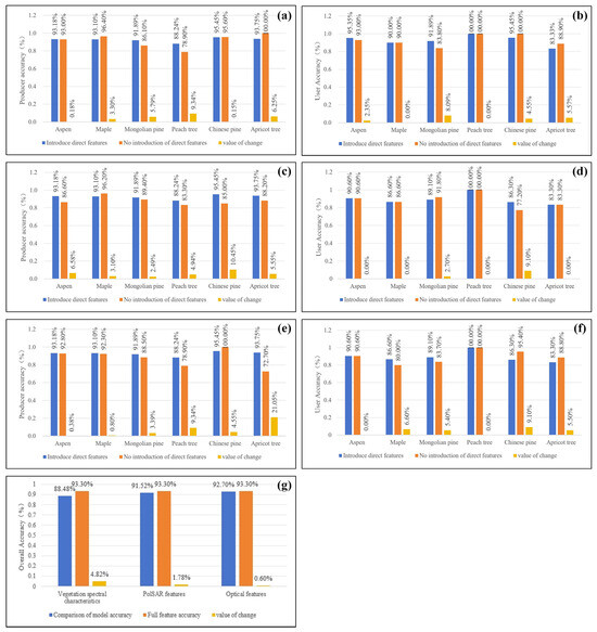 Results of feature ablation experiments. ((a) is the producer accuracy of the PolSAR feature ablation experiment; (b) is the user accuracy of the PolSAR feature ablation experiment; (c) is the producer accuracy of the optical feature ablation experiment; (d) is the user accuracy of the optical feature ablation experiment; (e) is the producer accuracy of the vegetation spectral feature ablation experiment; (f) is the user accuracy of the vegetation spectral feature ablation experiment; and (g) is the overall accuracy of the three overall accuracies of the feature ablation experiments).