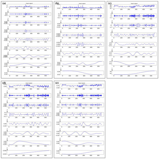 Plot of Hilbert–Huang transform results. ((a) Hilbert–Huang transform result for C11; (b) Hilbert–Huang transform result for C22; (c) Hilbert–Huang transform result for alpha; (d) Hilbert–Huang transform result for anisotropy; and (e) Hilbert–Huang transform result for entropy).