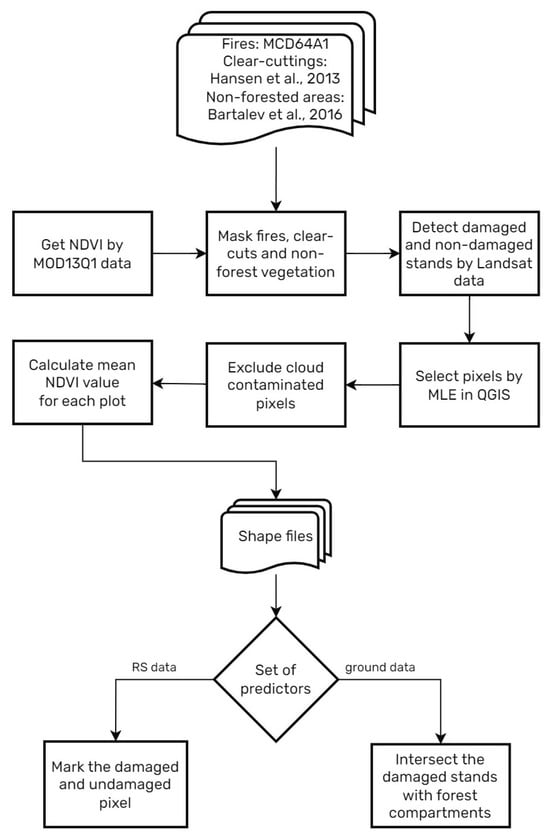 To identify forest areas damaged by the Siberian moth, we employed the use of the NDVI index, which was calculated using MODIS data (Figure 2). The NDVI values were extracted from the MOD13Q1 vegetation index product [59] with a spatial resolution of 250 m per pixel. The data set encompassed the period of highest photosynthetic activity of vegetation (from June to September) in 2014–2018. To identify and exclude from the analysis any changes in NDVI associated with fires, the MCD64A burned area product [60], also formed using MODIS data, was used (Figure 2). Thematic MODIS products were loaded using the LAADS (Level-1 and Atmosphere Archive & Distribution System) service. A comparable issue pertaining to clear cuts was addressed through the utilization of the global forest cover loss map [57]. The lands with non-forest vegetation were identified using a vegetation map developed at the Russian Space Research Institute of the Russian Academy of Sciences [56] (Figure 2). The RS data were divided into training and test samples using Landsat images (spatial resolution of 30 m) obtained from the US Geological Survey website [61]. Visual interpretation was used to identify areas covered with dark coniferous stands, damaged and undamaged by the Siberian moth (Figure 2).