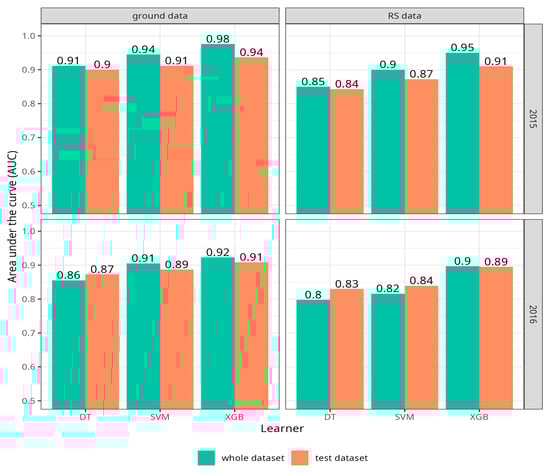 When both ground data and RS data are employed in a predictive model, the contributions of the predictors in 2015 and 2016 are distributed in a similar manner (Figure 5).