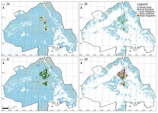 The results of the forecasting of defoliation of forest stands by the Siberian moth Dendrolumus sibiricus Tschetv. using the XGB algorithm: (a,b) based on stand characteristics for 2015 and 2016, respectively; (c,d) based on RS data for the same years.
