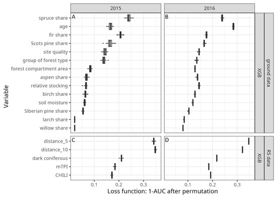 The most significant predictors, as indicated by the ground data, were the share of spruce, fir, and Scots pine in the stand’s growing stock, age, site quality, and group of forest types. In the model trained on 2016 data, a notable contribution was also observed for the share of aspen (Populus tremula L.) and birch, relative stocking, and forest compartment area (Figure 5A,B).