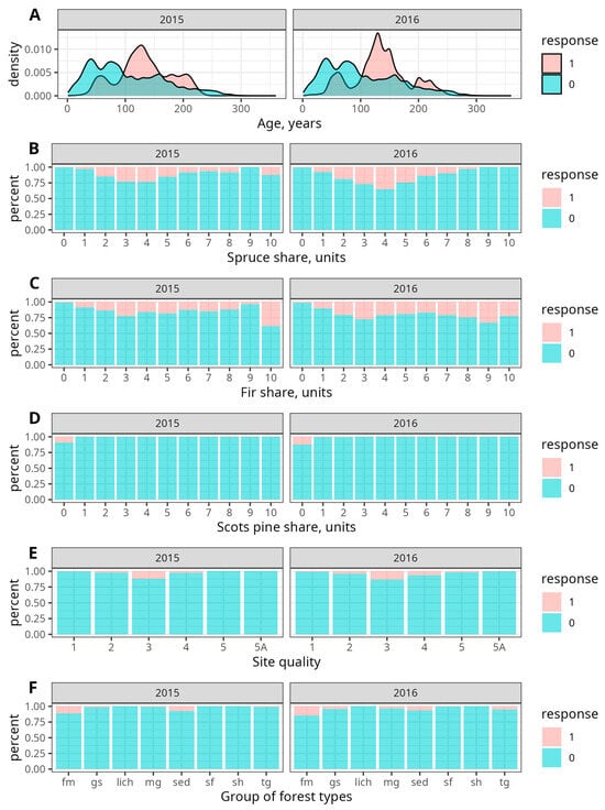 The degree of dependence of a forest stand belonging to a specific class (defoliated or not defoliated) is contingent upon its species composition (Figure 6). Forest stands comprising a minimum of one unit (equivalent to 10% of the stand’s growing stock) of Scots pine are rarely classified as damaged (Figure 6D). Similarly, the proportion of aspen and birch exceeding one unit is also an unlikely indicator of damage to the forest stand. Conversely, an increase in the proportion of fir in a forest stand comprising two or more units elevates the likelihood of the model classifying the forest stand as damaged (Figure 6C). The interrelation between the classification of a forest stand as defoliated and the proportion of spruce is close to a binomial distribution, with a maximum of approximately four units (Figure 6B). The probability of a forest stand being classified as damaged is demonstrably higher within the age range of 100–250 years (Figure 6A). The classification outcome is clearly dependent on stand productivity. Damage is most often predicted for stands of the third site quality class, and to a lesser extent for the second and fourth (Figure 6E). Notable differences are observed in the forecast results for different forest type groups between 2015 and 2016 (Figure 6F). If, at the outset of the outbreak, damage is predicted almost exclusively for feather moss and sedge stands, then in the following season, the probability of damage caused by the Siberian moth increases for forests of tallgrass, mixed grass, and grass-swamp groups of types.