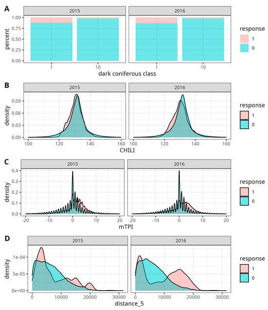 Distribution of predictor values obtained using RS data in relation to the outcomes of the model forecast (A) the proportion of preferred tree species in the stand composition, where class 1 corresponds to stands dominated by dark coniferous species and class 10 to a near-equal proportion of dark coniferous and deciduous tree species, (B) the CHILI index, (C) the mTPI index, and (D) the distance to the nearest forest stand that was disturbed five or less years before the Siberian moth Dendrolumus sibiricus Tschetv. outbreak).