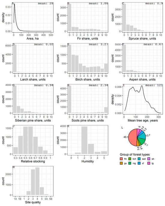 Empirical distributions of the predictors for the area under study. For the predictors measured on a ratio scale, the mean values are also provided. (A) mean areas of the forest compartments; (B) share of Siberian fir Abies sibirica Ledeb. in the stands; (C) the same for spruce Picea obovata Ledeb.; (D) the same for larch Larix sibirica Ledeb.; (E) the same for birch Betula ssp.; (F) the same for aspen Populus tremula L.; (G) the same for Siberian pine Pinus sibirica Du Tour; (H) the same for Scots pine Pinus sylvestris L.; (I) mean tree ages; (J) relative stockings; (K) soil humidities; (L) groups of forest types proportions (percents); (M) site qualities. The codes used to identify group of forest types: fm—feather moss, gs—grass-swamp, lich—lichen, mg—mixed grass, sed—sedge, sf—sfagnum, sh—shrub, tg—tall-grass.