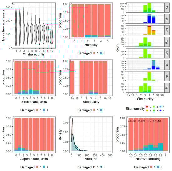 Relationships between some variables. (A) mean age and share of fir Abies sibirica Ledeb.; (B) share of birch Betula ssp. and defoliation; (C) share of aspen Populus tremula L. and defoliation; (D) humidity and defoliation; (E) site quality and defoliation; (F) forest compartment area and defoliation; (G) site quality, humidity and group of forest type; (H) relative stocking of stands with share of fir ≥ 2 units and defoliation. Group of forest types: fm—feather moss, gs—grass-swamp, lich—lichen, mg—mixed grass, sed—sedge, sf—sfagnum, sh—shrub, tg—tall-grass.