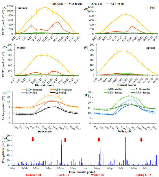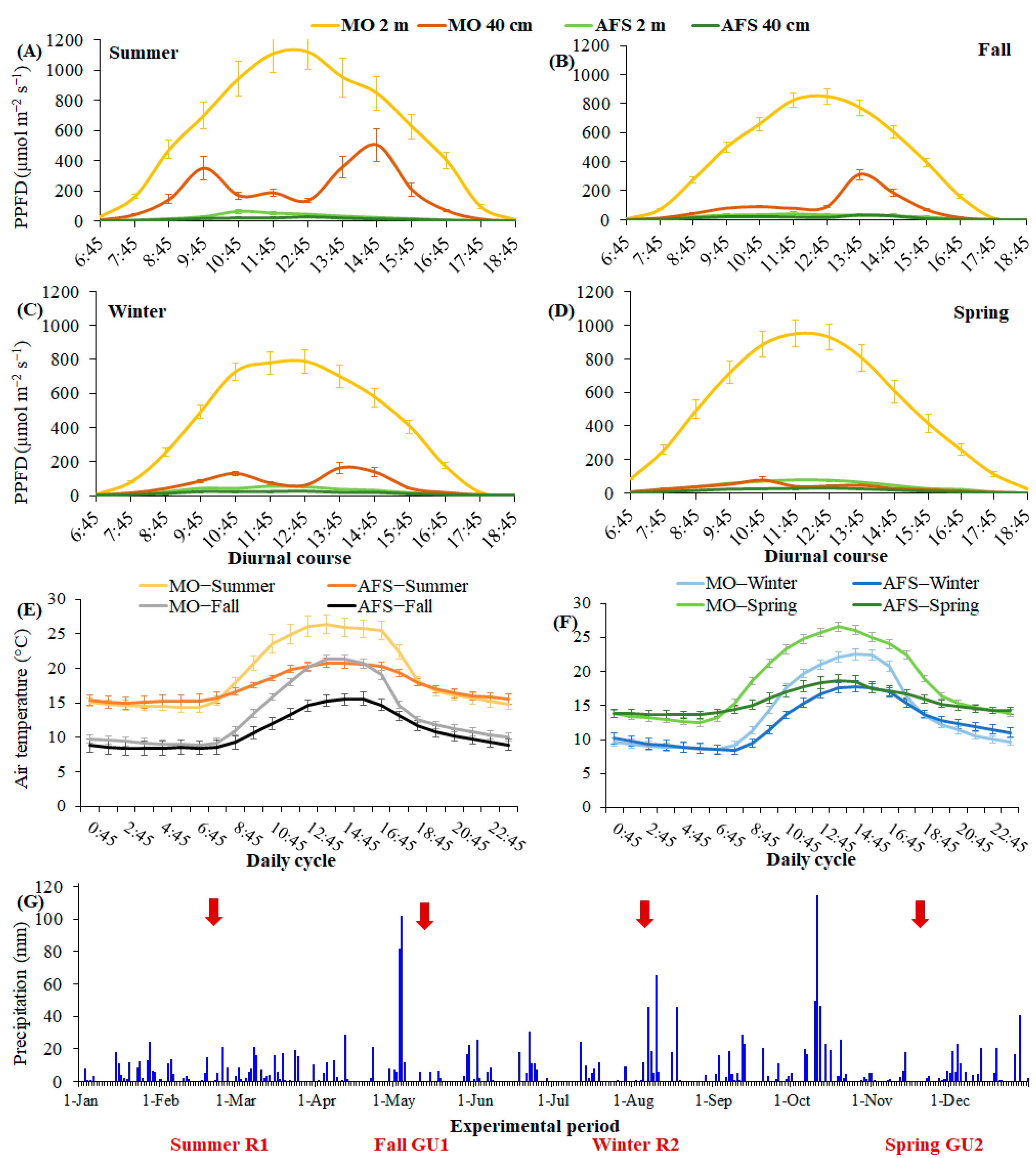 Microclimate in the monoculture (MO) and agroforestry (AFS) of yerba mate. Mean ± SE (n = 18–72) for photosynthetic photon flux density (PPFD) measured over the diurnal cycle at two heights from the soil surface (2 and 0.4 m) during the summer (A), fall (B), winter (C), and spring (D), and air temperature measured over the daily cycle at 2 m height from the soil surface during the summer and fall (E) and during the winter and spring (F). In (G), daily precipitation during the experimental period (year 2022) is shown. Red arrows indicate when physiological measurements were taken during seasons and growth periods [(rests 1 and 2 (R1 and R2) and growth unit formations (GU1 and GU2)].