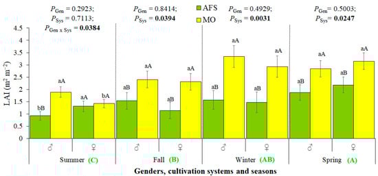 Yerba mate leaf area index (LAI) estimated in two cultivation systems (monoculture—MO and agroforestry system—AFS) for two genders (female—♀ and male—♂) in four seasons [summer—rest 1 (R1); fall—growth unit 1 (GU1); winter—rest 2 (R2); spring—growth unit 2 (GU2)]. Estimated mean ± SE and P-values (bold when significant) are shown (n = 6). Lowercase black letters compare genders (Gen) in each cultivation system (Sys) and each season, whereas uppercase black letters compare cultivation systems for each gender in each season. The uppercase green bold letters at the bottom position compare seasons (n = 24, P < 0.0001).