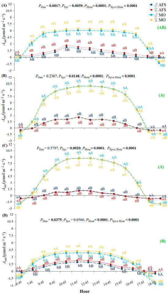 Yerba mate leaf net CO2 assimilation rate (Anet) estimated in two cultivation systems (monoculture—MO and agroforestry system—AFS) for two genders (female—♀ and male—♂) during four seasons: (A) summer—rest 1 (R1), (B) fall—growth unit 1 (GU1), (C) winter—rest 2 (R2), and (D) spring—growth unit 2 (GU2)] along the diurnal period. Estimated mean ± SE and P-values (bold when significant) are shown (n = 6). Lowercase, colored letters compare genders (Gen) under each cultivation system (Sys) for each hour and each season; uppercase, colored letters compare cultivation systems for each gender for each hour and for each season. The uppercase bold green letters in parenthesis on the right side compare general Anet seasonal responses (P < 0.0001).