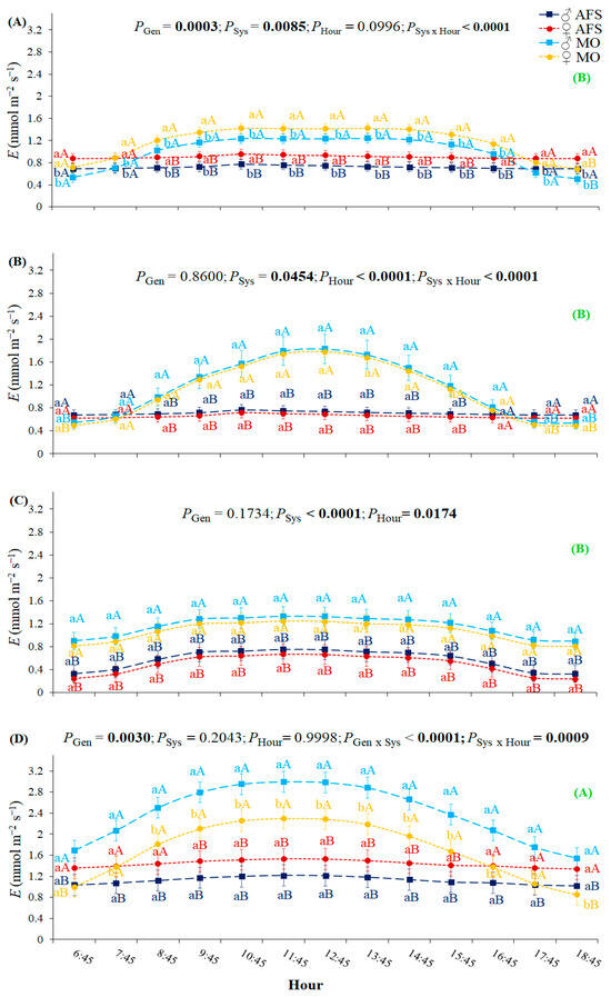 Yerba mate leaf transpiration rate (E) estimated in two cultivation systems (monoculture—MO and agroforestry system—AFS) for two genders (female—♀ and male—♂) during four seasons: (A) summer—rest 1 (R1), (B) fall—growth unit 1 (GU1), (C) winter—rest 2 (R2), and (D) spring—growth unit 2 (GU2)] for each hour. Estimated mean ± SE and P-values (bold when significant) are shown (n = 6). Lowercase colored letters compare gender (Gen) responses under each cultivation system (Sys) for each hour and each season; uppercase colored letters compare cultivation systems for each gender, hour, and season. The uppercase bold green letters in parenthesis on the right side compare general E seasonal responses (P < 0.0001).