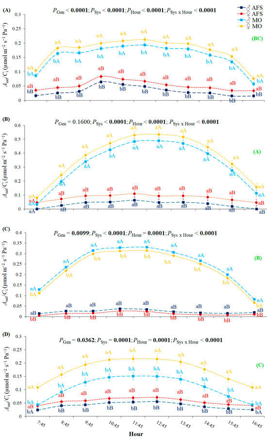 Yerba mate Anet/Ci ratio estimated in two cultivation systems (monoculture—MO and agroforestry system—AFS) for two genders (female—♀ and male—♂) during four seasons: (A) summer—rest 1 (R1), (B) fall—growth unit 1 (GU1), (C) winter—rest 2 (R2), and (D) spring—growth unit 2 (GU2)] for each hour. Estimated mean ± SE and P-values (bold when significant) are shown (n = 6). Lowercase colored letters compare gender (Gen) responses under each cultivation system (Sys) for each hour and season; uppercase, colored letters compare cultivation systems for each gender, hour, and season. The uppercase, bold, green letters in parenthesis on the right side compare general Anet/Ci seasonal responses (P < 0.0001). Different y-axis scales for seasons are used to observe the gender segregations.