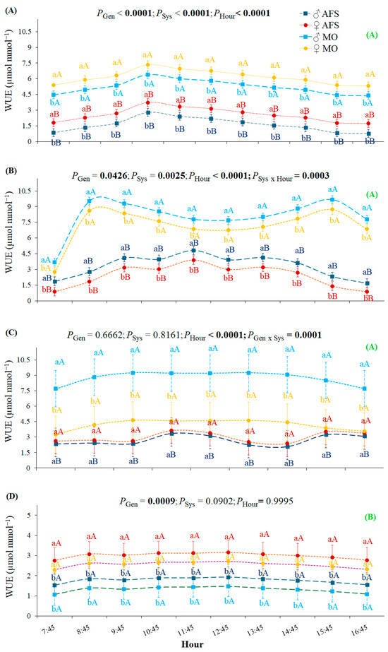Yerba mate instantaneous water use efficiency (WUE) estimated in two cultivation systems (monoculture—MO and agroforestry system—AFS) for two genders (female—♀ and male—♂) during four seasons: (A) summer—rest 1 (R1), (B) fall—growth unit 1 (GU1), (C) winter—rest 2 (R2), and (D) spring—growth unit 2 (GU2)] for each hour. Estimated mean ± SE and P-values (bold when significant) are shown (n = 6). Lowercase, colored letters compare gender (Gen) responses under each cultivation system (Sys) for each hour and season; uppercase, colored letters compare cultivation systems for each gender, hour, and season. The uppercase, bold, green letters in parenthesis on the right side compare general WUE seasonal responses (P < 0.0001). Different y-axis scales for seasons are used to observe the gender segregations.