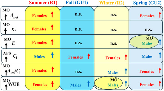 Summary of the gender dominance in yerba mate leaf gas exchange (net CO2 assimilation rate—Anet, stomatal conductance—gs, transpiration rate—E, intercellular CO2 concentration—Ci, instantaneous carboxylation efficiency—Anet/Ci ratio, and instantaneous leaf water use efficiency—WUE) during the annual rhythmic growth [summer—rest 1 (R1), fall—growth unit 1 (GU1), winter—rest 2 (R2), and spring—growth unit 2 (GU2)] under two contrasting cultivation systems (monoculture—MO and agroforestry—AFS). The black upper arrows indicate the cultivation system with higher values for each of leaf gas exchange parameters. The dominance of females (red) or males (blue) is marked with upper arrows, while ‘n.s.’ means no significant gender dominance. Two cases when SSD expression was modified by the cultivation system, being expressed only in MO with male dominance in E and WUE, are tagged with yellow ovals.