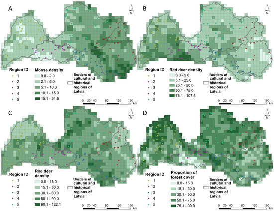 - Done, G.; Ozoliņš, J.; Bagrade, G.; Jansons, J.; Baumanis, J.; Vecvanags, A.; Jakovels, D. A case study for best suitable methods of monitoring demographic structure in cervid populations to predict increasing forest damages. Silva Fenn. 2024, 58, 23025. [Google Scholar] [CrossRef]