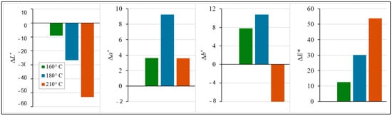 Changes in the L*, a*, and b* coordinates were also reflected in the overall color difference ΔE (Figure 4). Already after thermal treatment at 160 °C, the overall average color difference ΔE = 12.54, which already represents a different color compared to the original color [53]. As can be seen from Figure 5, thermal treatment at higher temperatures increased the ΔE values several fold.