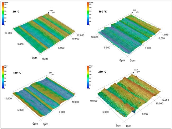 The morphology of the thermal-treated wood surface structure after having finished the aging process was also studied with the aid of a Keyence VHX 7000 digital microscope (Keyence Corporation, Osaka, Japan). All surfaces were scanned using a VH-Z100R camera (Keyence Corporation, Osaka, Japan) performing at a 200-fold amplification. The scan size was 10 × 10 mm. The scanned surfaces were processed by applying a topographic height map, and in this way, 3D morphological patterns were generated for each surface.