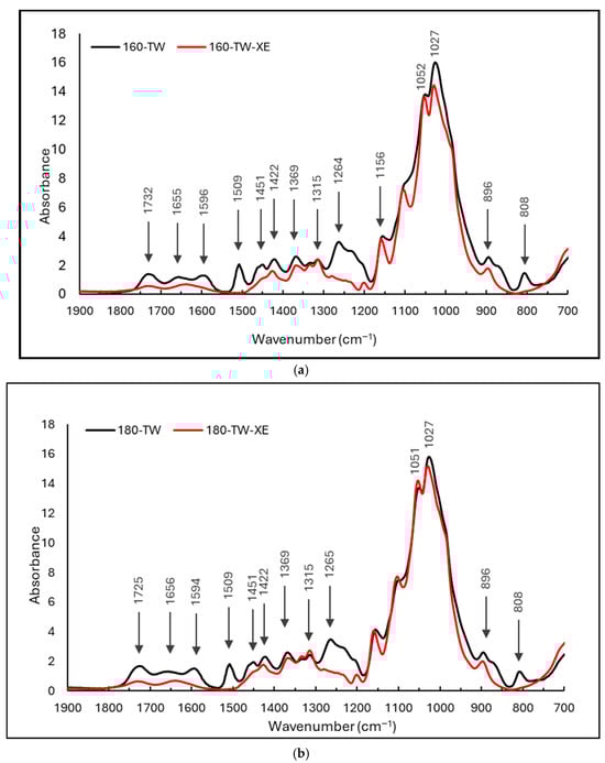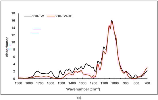 (a). FTIR spectra of spruce wood thermally treated at 160 °C (160-TW) and after accelerated aging (160-TW-XE). (b). FTIR spectra of spruce wood thermally treated at 180 °C (180-TW) and after accelerated aging (180-TW-XE). (c). FTIR spectra of spruce wood thermally treated at 210 °C (210-TW) and after accelerated aging (210-TW-XE).