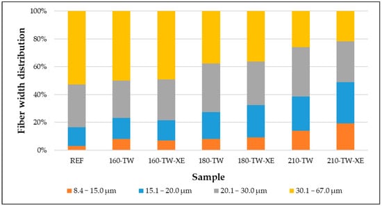 The thermal treatment and subsequent Xenotest exposure also impacted the fiber width. The reference sample contained 52.79% of fibers wider than 30.1 μm. Thermal treatment at 160 °C induced only minor changes in the fiber width distribution (Figure 10), and the Xenotest had an insignificant impact on fibers treated at this temperature. At 180 °C, the number of fibers wider than 30.1 μm decreased by 29%, with no substantial additional effect from the Xenotest. However, treatment at 210 °C reduced the fraction of fibers wider than 30.1 μm by 51%, with the Xenotest contributing an additional 8% reduction.