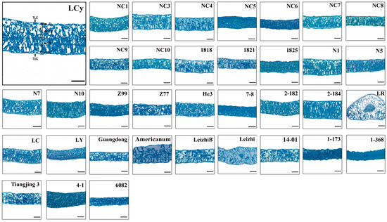 As can be seen from the slice map (Figure 1), there are obvious ridges in the dorsoventral surface of different barbary wolfberry leaves and an obvious cuticle outside the cells of the epidermis. The obviously differentiated palisade tissue and spongy tissue show the barbary wolfberry leaves. The distinct palisade and spongy tissues in goji leaves indicate a dorsiventral leaf structure. The observation results show that the palisade tissue in Z99, N10, LC, LCy, Guangdong, 1-173, and 6082 consists of one to two layers, while in NC5, 1825, N1, N5, N7, He3, 2-182, LR, LY, 14-01, 1-368, and 4-1, it consists of two to three layers. For most goji species, the palisade tissue is composed of a single layer of well-arranged columnar cells.