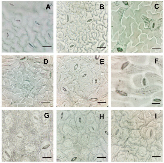 Stomata in the lower epidermis of the leaves of different cultivars (lines). (A) Americanum; (B) Z77; (C) Tianjing 3; (D) NC6; (E) 1825; (F) LR; (G) N10; (H) NC7; (I) N5. Bar = 100 μm.