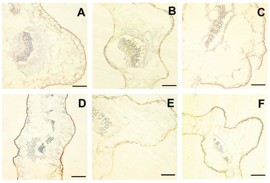 Part of goji leaf wax frozen section. (A) LR; (B) LCy, (C) Tianjing 3; (D) Lezhi; (E) Guangdong; (F) NC10. The sections stained with the Oil Red method show the wax layer as the part that turned red in the image. Bar = 100 μm.