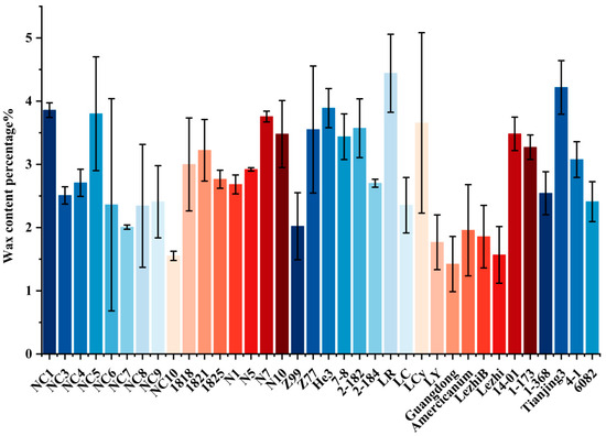 Wax proportion in frozen sections of the 36 different goji cultivars (lines) tested. The error bars represent the difference between the wax proportion of individual goji lines and the mean wax proportion of the same line; the goji cultivars (lines) are represented by the abbreviations in the image, as listed in Table 1.