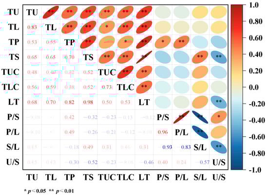 Correlation analysis of leaf character traits. Red denotes a positive correlation between traits, whereas blue signifies a negative correlation. The intensity of the color indicates the strength of the correlation between traits, with darker shades representing a stronger relationship. The numbers in the graph indicate the degree of correlation, with higher numbers suggesting a stronger correlation. * p ≤ 0.05 indicates a statistically significant correlation between traits, and ** p ≤ 0.01 indicates a highly statistically significant correlation. Definitions of traits: TU: Thickness of upper epidermis; TL: Thickness of lower epidermis; TP: Thickness of palisade tissue; TS: Thickness of spongy tissue; TUC: Cuticle thickness of upper epidermis; TLC: Thickness of lower epidermis cell; LT: Leaf thickness; P/S: Palisade tissue and spongy tissue ratio; P/L: Palisade tissue and leaf ratio; S/L: Spongy tissue and leaf ratio; U/S: Upper epidermis and spongy tissue ratio.