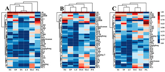 Clustering analysis of different cultivars (lines) of goji traits and associated stress resistance, presented as a heatmap. (A) illustrates the heatmap clustering analysis of various goji traits and insect resistance; a color closer to red indicates a stronger correlation between the trait and the goji line. (B) illustrates the heatmap clustering analysis of various goji traits in relation to cold resistance. (C) illustrates the heatmap clustering analysis of various goji traits in relation to drought resistance. TU refers to the thickness of the upper epidermal cells; TP denotes the thickness of the palisade tissue; TUC indicates the thickness of the upper epidermal cuticle; TLC represents the thickness of the lower epidermal cuticle. P/S refers to the palisade-to-spongy ratio, while P/L denotes the palisade-to-leaf ratio. CTR refers to the compactness of leaf tissue, while SR denotes the sponginess of leaf tissue. The numerical identifiers for the 36 goji cultivars (lines) depicted in the figure correspond to the goji entries presented in Table 1.