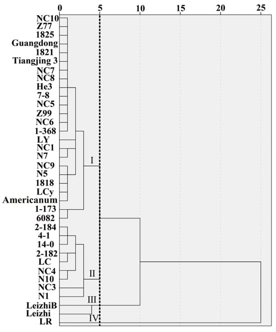 Cluster analysis of 36 goji germplasm resources. The designations I, II, III, IV signify that at a distance value of 5 (represented by the dashed line in the figure), the cultivars (lines) were categorized into four primary groups according to their similarity. The numerical identifiers for the 36 goji cultivars (lines) depicted in the figure correspond to the goji entries presented in Table 1.