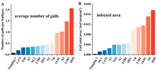By analyzing the average gall count (number of galls/number of leaves) and the infection area (total area of galls/total leaf area) in natural field infection settings, the resistance of different goji strains and variations to A. pallida was evaluated [22,23]. The findings (Figure 8) showed that different cultivars (lines) exhibited significant differences in their ability to withstand A. pallida, with the two metrics of the average number of galls per leaf and the ratio of infected area to total area producing results that were generally consistent. While N5 exhibited the highest sensitivity to A. pallida, Tianjing 3 showed the highest resistance, whereas the conventional N1 showed moderate resistance. The findings in this section align closely with the previous analysis regarding the wax proportion and its impact on stress resistance.