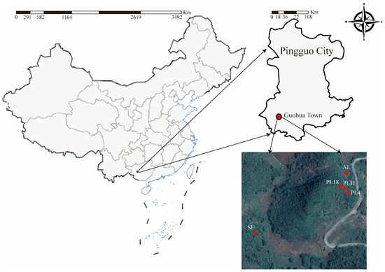 The study was carried out in Longhe, Guohua Town, Baise City, Guangxi Zhuang Autonomous Region (23°20′31″–23°24′1″ N; 107°22′14″–107°25′9″ E; 310 m altitude) (Figure 1), which has a subtropical monsoon climate, with high temperatures and heavy rainfall in summer, low temperatures and heavy rainfall in winter, an average annual temperature of 21.5 °C, sufficient heat, rainfall primarily concentrated between May and August, and the average annual precipitation of 1070.6 mm. The karstic rocky desertification area of this study is made of limestone, dolomite, and mixed rock [34]; the soil is mainly brown limestone. Twenty years after replacing farmland with planted forest, vegetation has grown substantially and is currently dominated by shrubs and small trees, including Delavaya toxocarpa, Biancaea sappan (L.) Tod., and Quercus glauca Thunb. Herbaceous plants include primarily Miscanthus floridulus (Labill.) Warburg ex K. Schumann, Bidens pilosa L., and Chromolaena odorata (L.) R. M. King & H. Rob.