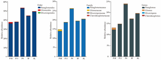 Community composition of arbuscular mycorrhizal fungi (AMF) with different tree ages and vegetation restoration strategies. P18, P11, and P4 represent Delavaya toxocarpa plantations planted in 2005, 2012, and 2019, respectively; SF is naturally restored secondary forest; and AL is naturally restored grassland after abandonment of land; stacked columns are relative abundance of taxa at taxonomic level of each order, family, and genus.