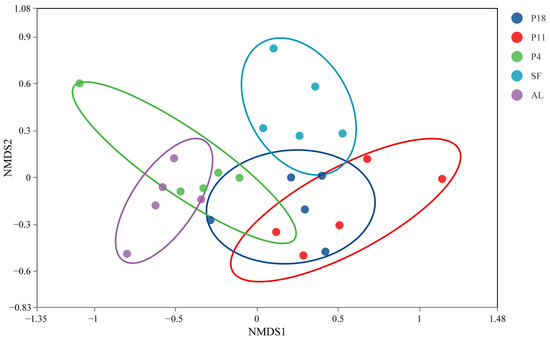 NMDS of AMF community composition based on operational taxonomic units (OTUs) for different tree ages and vegetation restoration strategies. P18, P11, and P4 represent Delavaya toxocarpa plantations planted in 2005, 2012, and 2019; SF is the naturally restored secondary forest; and AL is the naturally restored grassland after the abandonment of the land; the points of different colors represent different sample plots, and the calculations in all sample plots were based on the Bray–Curtis metrics, with a stress value of 0.13 < 0.2; therefore, the results are well represented.