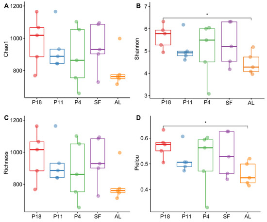 Effects of different tree ages and vegetation restoration strategies on α-diversity indices. P18, P11, and P4 are Delavaya toxocarpa forests planted in 2005, 2012, and 2019; SF represents naturally restored secondary forest; and AL represents grassland naturally restored after abandonment. (A) represents the Chao1 index, (B) represents the Shannon index, (C) represents AMF species richness in the rhizosphere soil, and (D) represents the Pielou index. All results for different tree ages or vegetation restoration strategies are presented as the mean ± standard deviation (n = 2). In the figure, * indicates significantly different plots under different tree ages and vegetation restoration strategies after multiple comparisons using the LSD (least significant difference) method (p < 0.05).