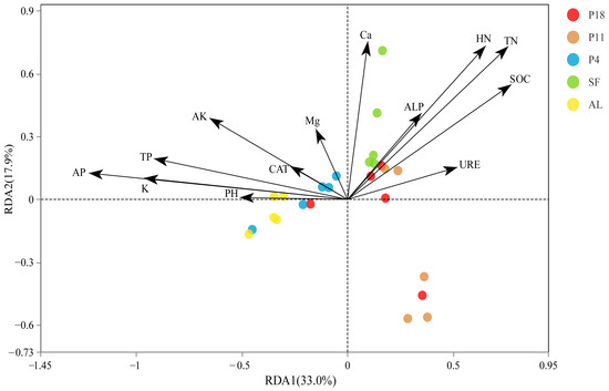 Redundancy analysis (RDA) between AMF community composition and soil-related indicators in different sites. Different-colored circles represent different plots: P18, P11, and P4 correspond to Delavaya toxocarpa plantations established in 2005, 2012, and 2019, respectively; SF represents naturally regenerated secondary forest without human intervention; AL represents grassland naturally regenerated after abandonment; SOC: soil organic carbon; TN: soil total nitrogen; HN: soil hydrolyzed nitrogen; TP: soil total phosphorus; AP: soil available phosphorus; K: soil potassium; AK: soil available potassium; Ca: soil exchangeable calcium; Mg: soil exchangeable magnesium; URE: soil urease activity; CAT: soil catalase activity; ALP: soil alkaline phosphatase activity.