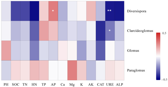 Heat map of correlation between soil physicochemical properties and enzyme activities with AMF genus. * represents significant correlation at p < 0.05 and ** represents highly significant correlation at p < 0.01. SOC: soil organic carbon; TN: soil total nitrogen; HN: soil hydrolyzed nitrogen; TP: soil total phosphorus; AP: soil available phosphorus; K: soil potassium; AK: soil available potassium; Ca: soil exchangeable calcium; Mg: soil exchangeable magnesium; URE: soil urease activity; CAT: soil catalase activity; ALP: soil alkaline phosphatase activity.