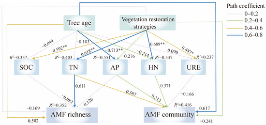 Structural equation modeling (SEM) describing the influences of tree age and vegetation restoration strategies on the community composition and OTU richness of AMF. SOC: organic carbon; TN: total nitrogen; AP: quick-acting phosphorus; HN: hydrolyzed nitrogen; URE: soil urease activity; AMF richness: AMF OTU richness; AMF community: AMF community composition. * represents significant correlation at p < 0.05 and ** represents highly significant correlation at p < 0.01. Numbers adjacent to the arrows indicate standardized path coefficients. The R2 value above each variable represents the proportion of the variance explained by the SEM model.