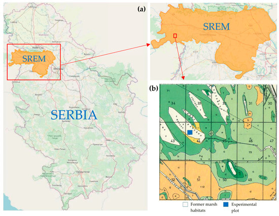(a) Pedunculate oak forest complex in Flat Srem in Serbia; (b) spatial distribution of former marsh habitats in the Management Unit, “Varadin-Županja”, compartment 44 [49]. The figure was created using maps from [50].