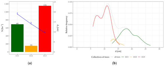 (a) The total number of narrow-leaved ash (Fraxinus angustifolia Vahl) trees shown per crown class (CC1—predominant/dominant, CC2—co-dominant and CC3—dominated and suppressed trees). Different letters indicate significant differences in mean DBHs at the level p < 0.05 based on the LSD test; (b) diameter distributions.