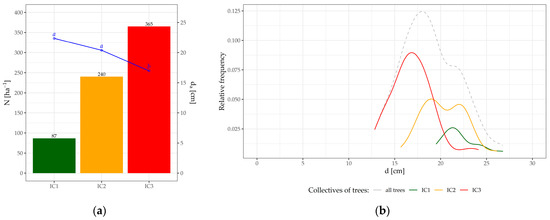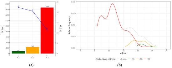 (a) The total number of narrow-leaved ash (Fraxinus angustifolia Vahl) predominant/dominant trees (CC1) trees shown per the isolation of the crown (IC1—free crown or up to 25% contact with neighbouring crowns; IC2—reduced crown from one side, contact 25%–50% with neighbouring crowns; IC3—reduced crown from two or more sides due to contact of >50% with the neighbouring crowns). Different letters indicate significant differences in mean DBHs at the level p < 0.05 based on the LSD test; (b) diameter distributions.