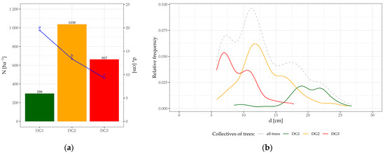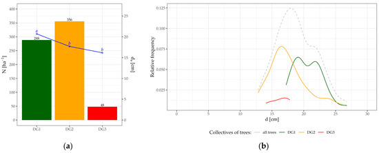 (a) The total number of narrow-leaved ash (Fraxinus angustifolia Vahl) trees defoliation groups (DG1—healthy trees, defoliation < 25%; DG2—significantly defoliated trees, defoliation 26%–80%; DG3—dead and dying trees, defoliation > 80%). Different letters indicate significant differences in mean DBHs at the level p < 0.05 based on the LSD test; (b) diameter distributions.
