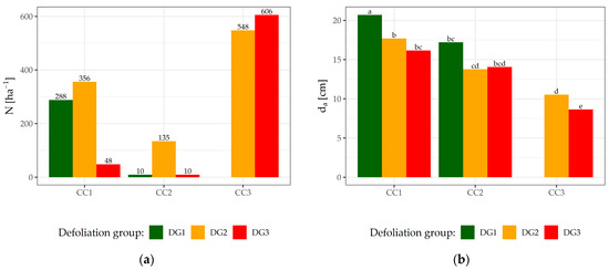 (a) The total number of narrow-leaved ash (Fraxinus angustifolia Vahl) trees shown per crown class (CC1—predominant/dominant, CC2—co-dominant and CC3—dominated and suppressed trees) and defoliation group (DG1—healthy trees, defoliation < 25%; DG2—significantly defoliated trees, defoliation 26%–80%; DG3—dead and dying trees, defoliation > 80%); (b) Different letters indicate significant differences in mean DBHs at the level p < 0.05 based on the LSD test.
