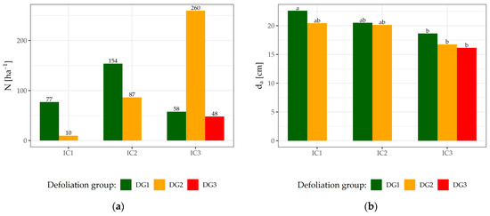 (a) The total number of narrow-leaved ash (Fraxinus angustifolia Vahl) predominant/dominant trees (CC1) shown per the degree of isolation of the crown (IC1—free crown or up to 25% contact with neighbouring crowns; IC2—reduced crown from one side, contact 25%–50% with neighbouring crowns; IC3—reduced crown from two or more sides due to contact of > 50% with the neighbouring crowns) and defoliation group (DG1—healthy trees, defoliation < 25%; DG2—significantly defoliated trees, defoliation 26%–80%; DG3—dead and dying trees, defoliation > 80%); (b) Different letters indicate significant differences in mean DBHs at the level p < 0.05 based on the LSD test.