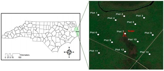 Location of the vegetation plots at the Alligator River National Wildlife Refuge. (ARNWR), Dare Country, North Carolina, USA. Map taken from Google Earth version 9.166.0.1 (accessed on 20 February 2024). The dark area in the photo is the adjacent loblolly pine stand that was subsequently killed by bark beetles. A carbon flux monitoring tower (US-NC4) is located in the middle of the study site.