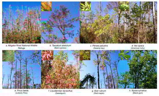 A closer look at the bottomland hardwood forest (a). Figures (b–h) are the general species composition surrounding the flux monitoring tower at the Alligator River National Wildlife Refuge in Dare County, North Carolina, USA. Photo credit: John Oliver Watts.
