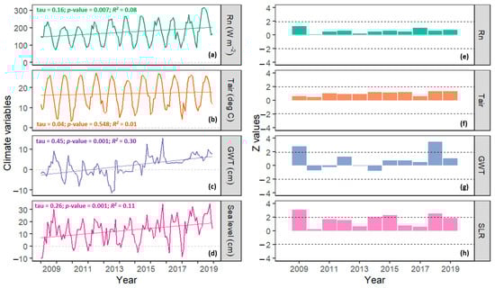 Variation in (a) net radiation (Rn), (b) air temperature, (c) relative groundwater table depth (GWT), and (d) sea level with Kendall trend analysis (left panels). The right panels (e–h) are the corresponding standard test statistic Zs for each climatic variables signifying trend direction (positive for increase, negative for decrease). Broken lines are the boundaries for critical Z at Significance level α = 0.05. Monthly data from 2009 to 2019 obtained from the US-NC4 flux tower in Alligator River National Wildlife Refuge, Dare County, North Carolina, USA.